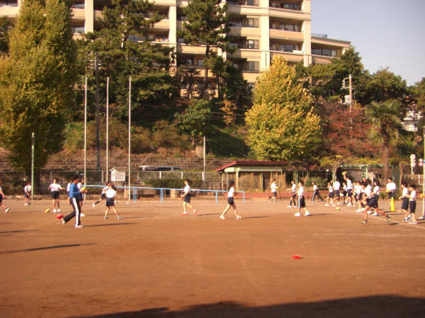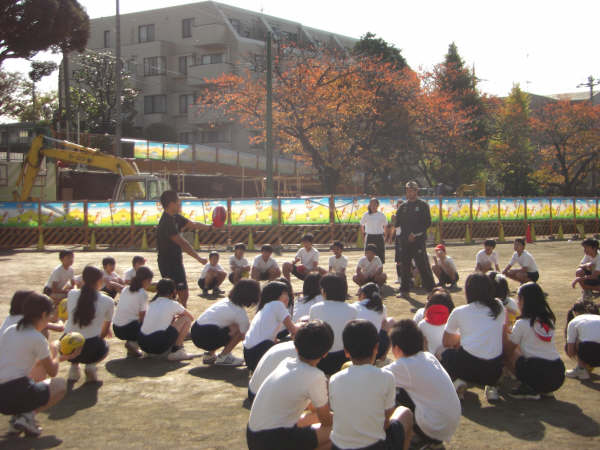 3時間目の前の休み時間に用具を準備していると早速子ども達が楕円のボールに興味を持ってくれて、校庭はフットボールで遊ぶ子ども達でいっぱいになりました!