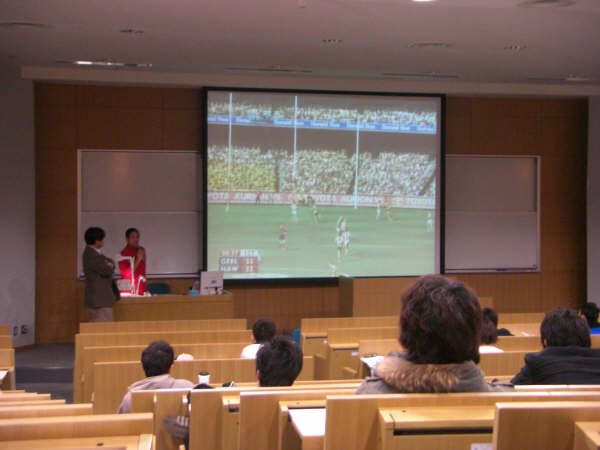 1時限目は講義でのオーストラリアンフットボール紹介。フィールド模型やボール、ユニフォームを使ってオーストラリアンフットボールを紹介し、試合のDVDも見てもらいました。授業の内容がサッカー・ラグビーなどのフットボールやリーグの成り立ち、変遷についての事でそれと絡めての紹介となりましたが、皆さんとても興味をもっていただき熱心に説明を聞いてくれました。