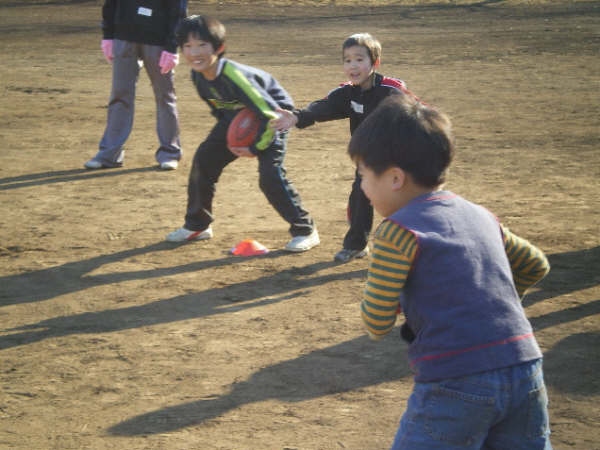 なんとか説明を終え、次は楕円のボールに慣れてもらうためのキャッチボールやゴロキャッチ。それからハンドパス、キックの練習へ。