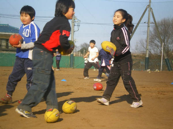 今回は初めて体験する子供たちが多くいたため、クリニックの内容はハンドパス、キックの練習や、簡単なゲームなどが中心。前回のクリニックに参加して、キックやハンドなどを覚えてくれていた子供たちには少し物足りない様子でしたが、「fun-土」では3週連続でクリニックを行うので、次回はオーストラリアンフットボールの試合に近いゲームで、オーストラリアンフットボールの楽しさを体感してもらいたいと思います。